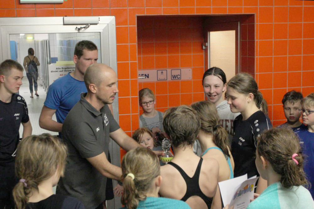 Bei den Siegerehrungen gratulierte unser 1. Vorsitzende Steffen Willms und überreichte die Trophäen. Auch unsere ehemaligen Vorsitzenden Hans-Paul Knippen (dessen Enkelin teilnahm), Hermann-Josef Aretz (als Protokollführer) und Egi Laufen (als fleißiger Helfer) waren dabei. Der Pokal für die beste Einzelleistung der Sechs- und Siebenjährigen ging an Hannes Damberg (Übach-Palenberg) und Victoria Wiebe (Würselen). Für die beste Einzelleistung bei den Mädchen wurden geehrt Mariella Weyrich (Jahrgang 2016), Leni Willems (JG 2015), Mila Jeske (JG 2014, alle Übach-Palenberg), Janne Merget (JG 2013), Nele Sofie Reichardt (JG 2012) und Lea Bayer (JG 2011, alle SG EST). Bei den Jungen siegte Lukas Jungnitsch (JG 2016, Übach-Palenberg), Noah Baranowski (JG 2015), Philian Niklas Wullen (JG 2014), Fynn Tomi (JG 2013), Pavlo Izhevskyi (JG 2012, alle SG EST) und Dennis Skobkov (JG 2011, Düren). Die Pokale für die beste Gesamtleistung blieben in unseren eigenen Reihen und gingen an Lea Bayer und Pavlo Izhevskyi. Und auch bei den Staffeln hatten wir die Nase vorn.