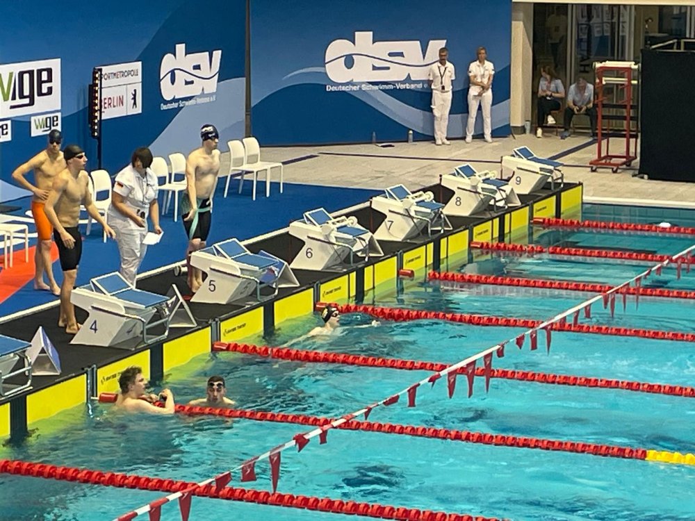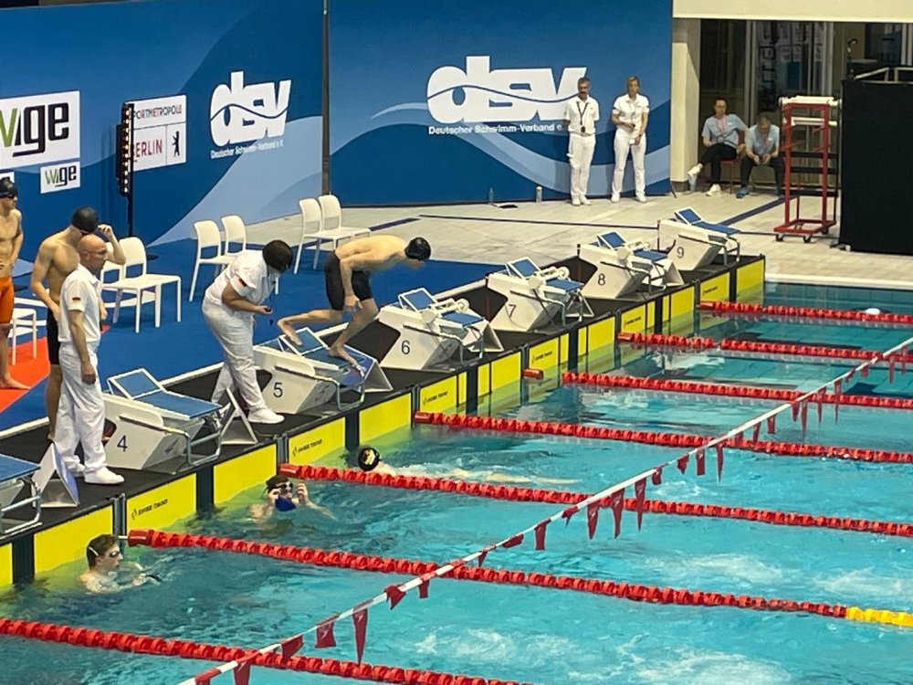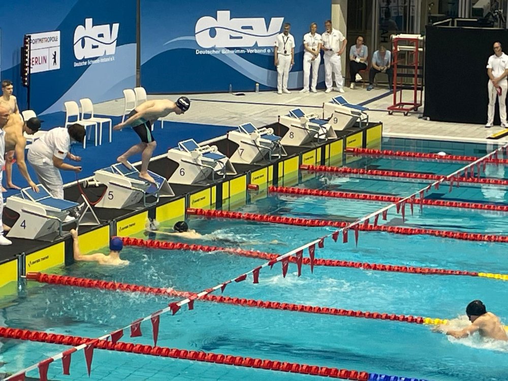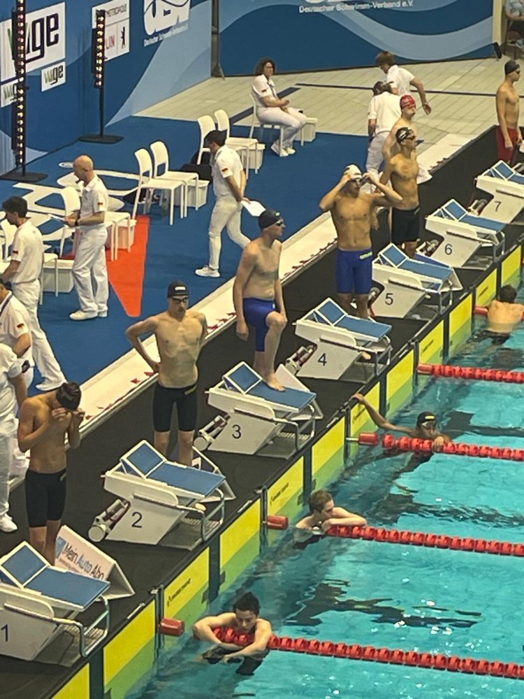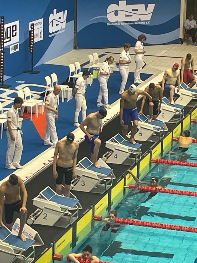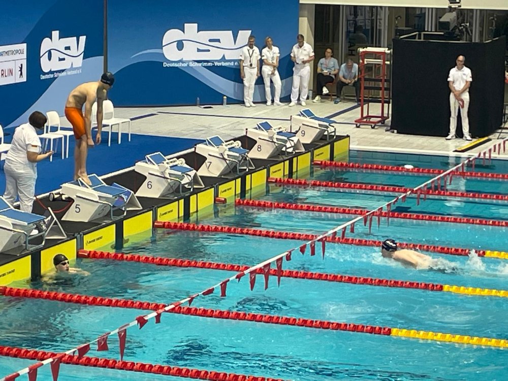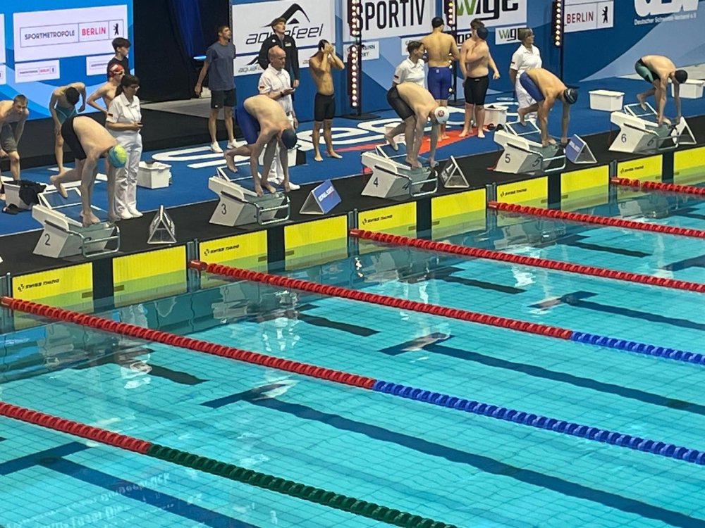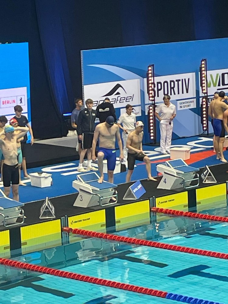 Für unsere Schwimmerinnen und Schwimmer war Berlin wieder einmal eine Reise wert. Für begehrte Einzelstartplätze unter den 50 Besten in jeder Disziplin qualifizierten sich Lukas Bücker, Elias Lamberty (Jahrgang 2007) und Jan Faulwetter (Jahrgang 2008) bei den Deutschen Meisterschaften. Lukas, über 200 Meter, 400 Meter, 800 Meter und 1500 Meter Freistil am Start, schwamm über die längste Strecke in 16:14,10 Minuten auf Platz 17 der nationalen Rangliste. Elias glänzte über 200 Meter Schmetterling mit einer Top-Zeit von 02:26,22 Minuten. Damit erreichte er den Reserveplatz des C-Finales, rücke in den Endlauf vor und schmetterte in 02:27,43 Minuten auf Rang 14 der Juniorenwertung (Jahrgänge 2007 bis 2009). Mit Jan Faulwetter (Jahrgang 2008) hatten wir einen weiteren Schmetterlingsschwimmer über die 200-Meter-Distanz (02:27,10 Minuten) im Rennen.