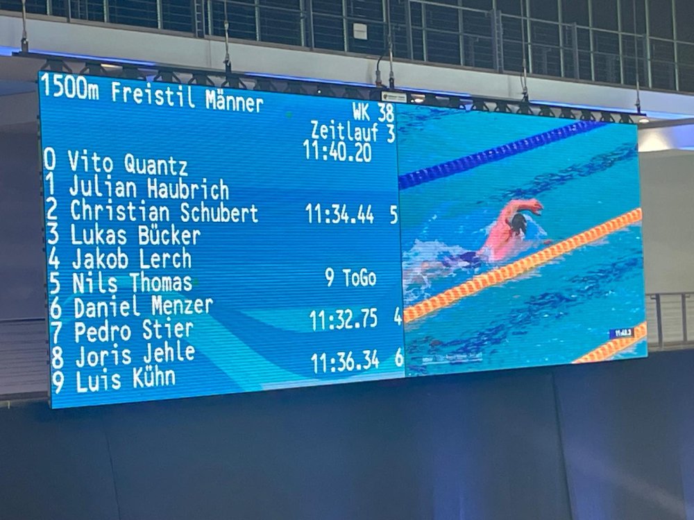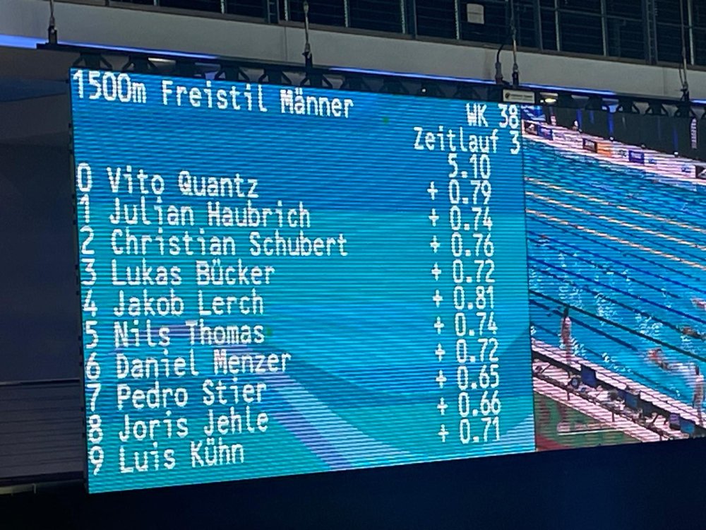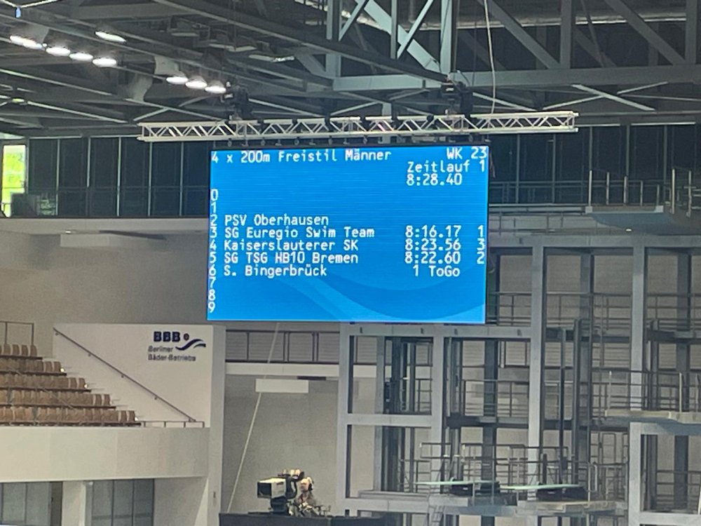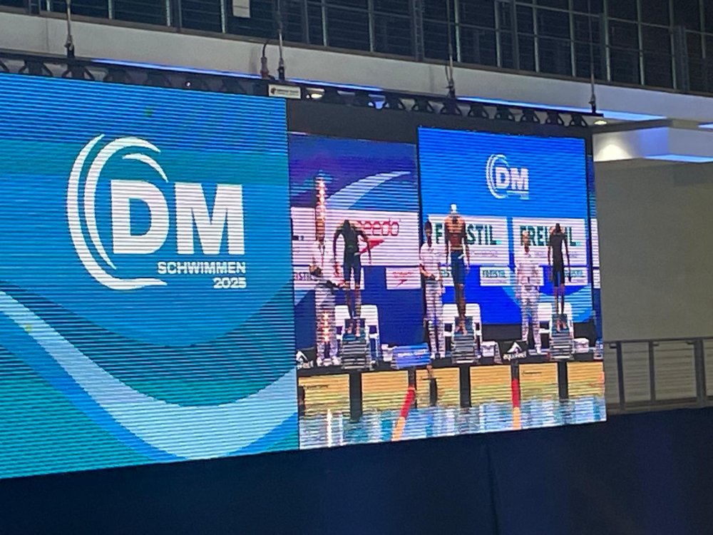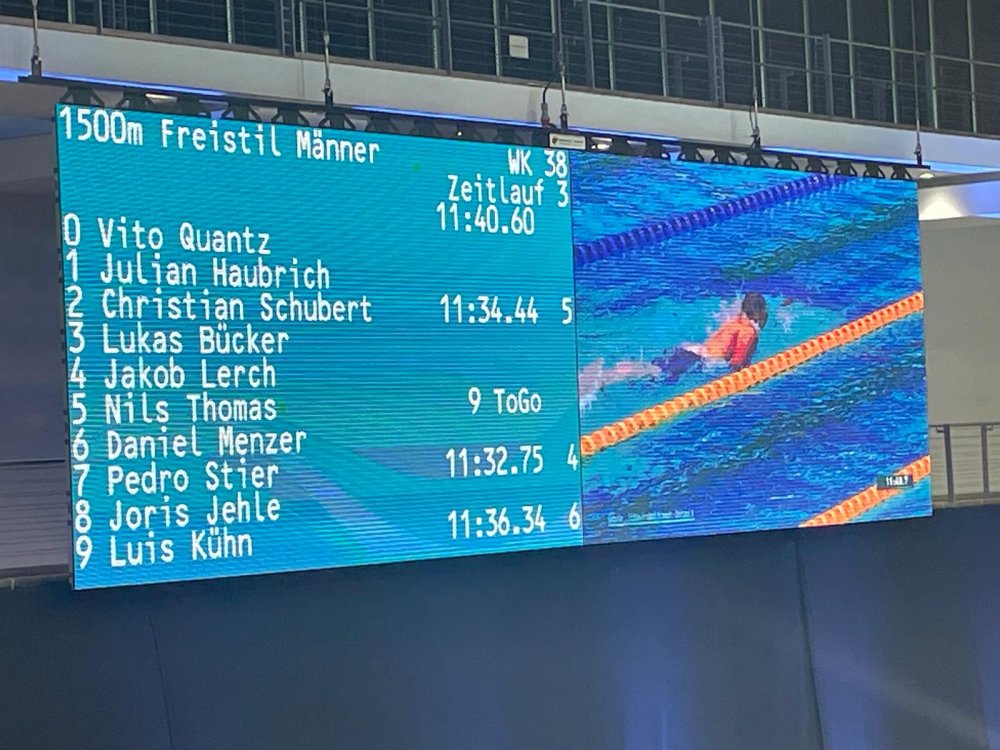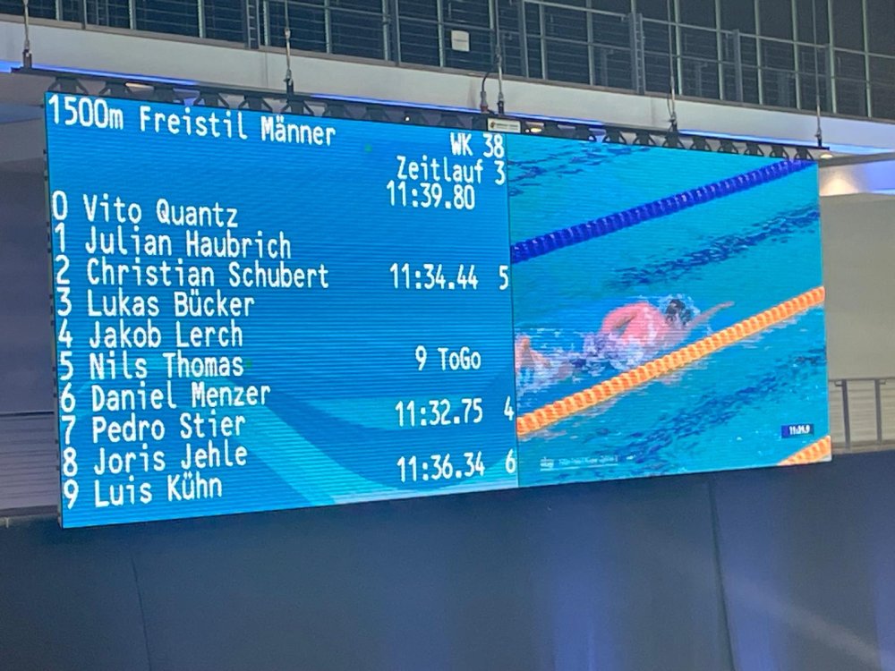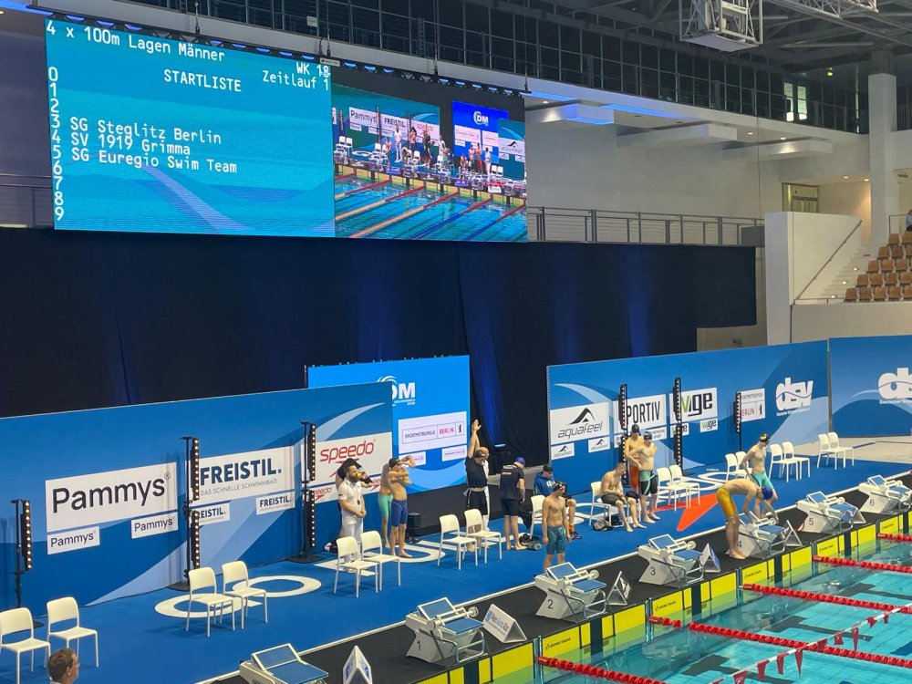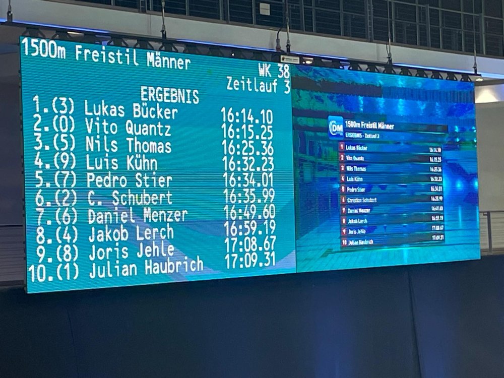 Für unsere Schwimmerinnen und Schwimmer war Berlin wieder einmal eine Reise wert. Für begehrte Einzelstartplätze unter den 50 Besten in jeder Disziplin qualifizierten sich Lukas Bücker, Elias Lamberty (Jahrgang 2007) und Jan Faulwetter (Jahrgang 2008) bei den Deutschen Meisterschaften. Lukas, über 200 Meter, 400 Meter, 800 Meter und 1500 Meter Freistil am Start, schwamm über die längste Strecke in 16:14,10 Minuten auf Platz 17 der nationalen Rangliste. Elias glänzte über 200 Meter Schmetterling mit einer Top-Zeit von 02:26,22 Minuten. Damit erreichte er den Reserveplatz des C-Finales, rücke in den Endlauf vor und schmetterte in 02:27,43 Minuten auf Rang 14 der Juniorenwertung (Jahrgänge 2007 bis 2009). Mit Jan Faulwetter (Jahrgang 2008) hatten wir einen weiteren Schmetterlingsschwimmer über die 200-Meter-Distanz (02:27,10 Minuten) im Rennen.