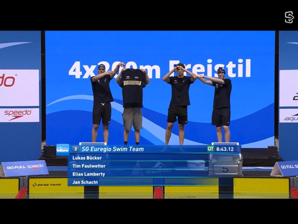 Sechs Staffeln stellten sich der nationalen Konkurrenz. Die 4 x 200 Meter Freistilstaffel der Männer schwamm unter die Top-Ten in 08:16,17 Minuten (Rang sieben). Unter den besten Zwanzig platzierten sich die 4 x 200 Meter Freistil-Mixedstaffel, die 4 x 100 Meter Freistilstaffel der Männer (jeweils Platz elf), die 4 x 100 Meter Lagen-Mixedstaffel (Platz 17) und die 4 x100 Meter Lagenstaffel der Männer (Platz 18). Am Erfolg der Staffeln waren in unterschiedlicher Besetzung beteiligt: Lea Bayer, Carolin Bogdol, Lukas, Tim und Jan, Elias und Jan Schacht. Betreut wurden die Aktiven von Trainer Cedric Gouder de Beauregard.